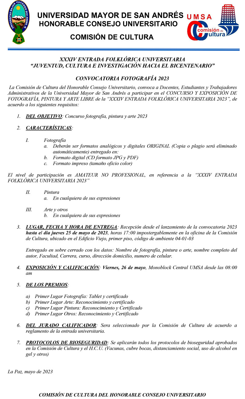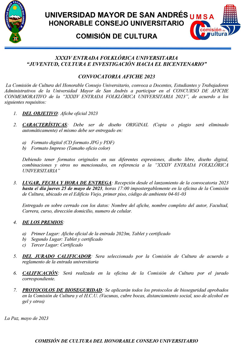 La Comisión de Cultura del Honorable Consejo Universitario de la UMSA lanza la convocatoria para los concursos de: