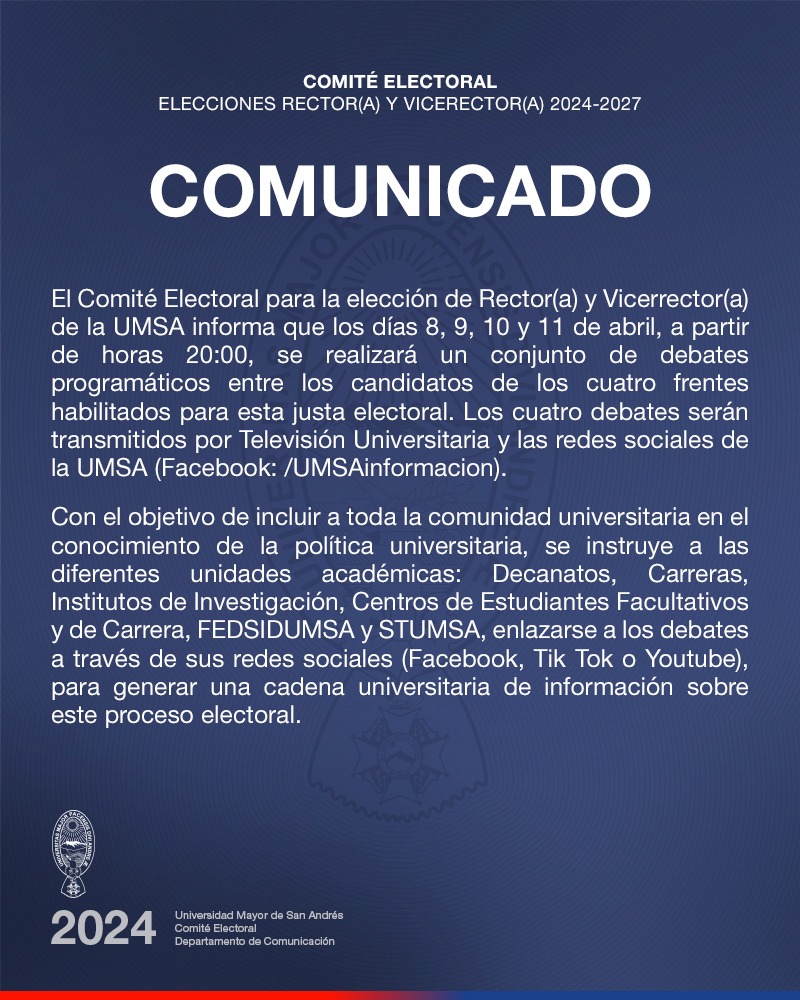 En esta sección encontrarás comunicados informativos de la Universidad Mayor de San Andrés, entre ellos temas; académicos, administración, resoluciones e información de interés para nuestra Comunidad Universitaria.